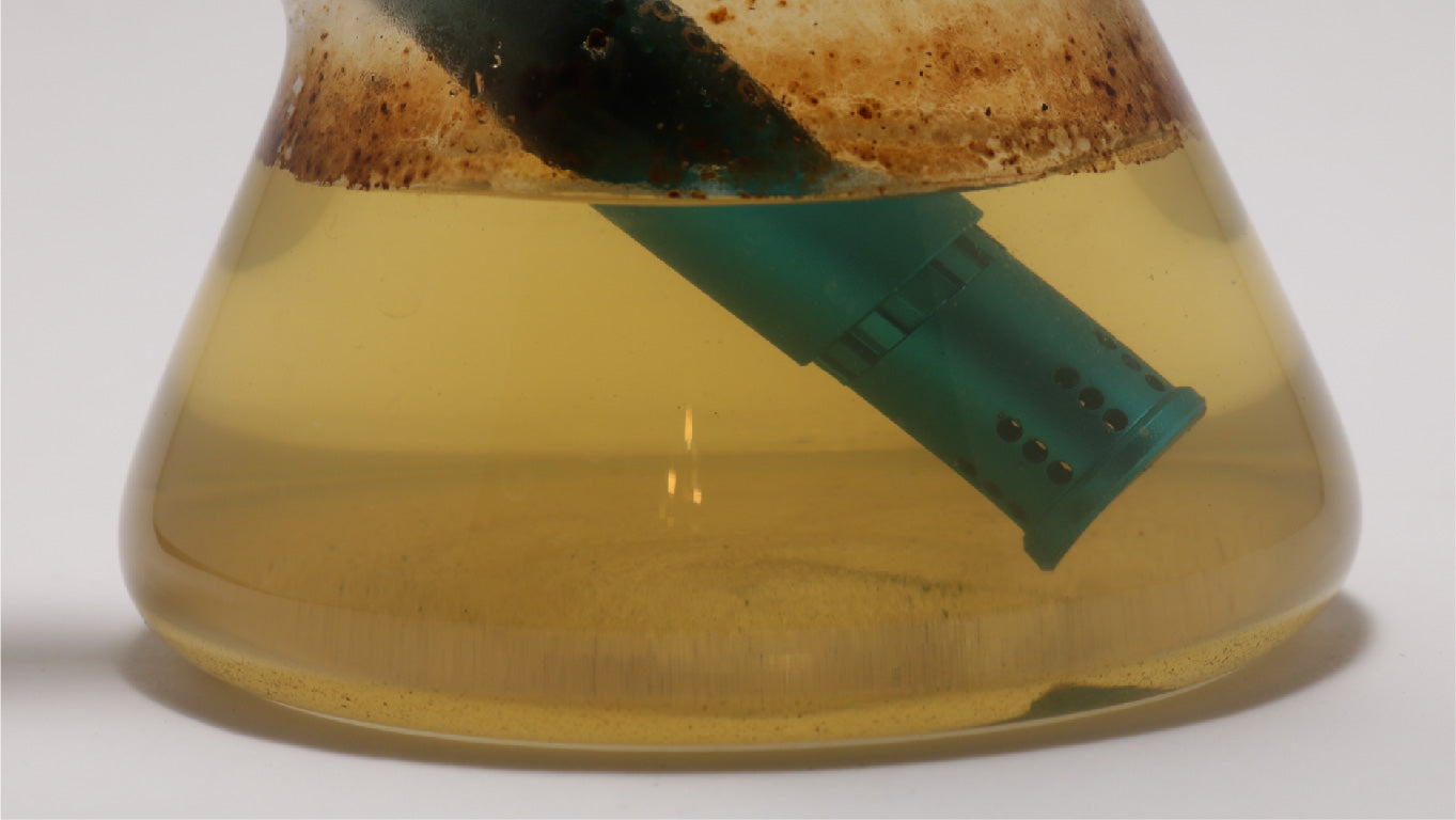 The glass-on-glass bong bowl and downstem combination on the left contains floating particles with bacteria, mold, fungi, mildew, ash, and unsmoked flower. The unbreakable bong bowl and downstem on the right use advanced technology to eliminate particulate deposits.